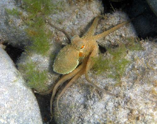 Sardaigne - Juillet 2009 Voir l'album photo de l'auteur Le mot du dictionnaire associé à cette photo ...poulpeLes mots clés du textecéphalopode | déplacement | homochromie | octopode | octopus | pieuvre | plongée | poulpe | 1 |Le poulpe (Octopus vulgaris) est un céphalopode que l'on rencontre sur toute la côte méditérranéenne. Egalement appelé pieuvre, le poulpe est un octopode, puisque son pied est divisé en huit tentacules de dimensions équivalentes (elles peuvent aller jusqu'à 1 mètre de longueur), toutes munies d'une double rangée de ventouses circulaires lui permettant de maintenir des objets ou des proies. Ses tentacules lui servent également de système de locomotion, par mouvements lents de reptation. Mais comme tous les céphalopodes, le poulpe peut effectuer des déplacements très rapides (attaque ou fuite) en expulsant l'eau par son entonnoir. Il possède également une poche d'encre lui permettant de se cacher derière son nuage d'encre. Mais le poulpe, souvent difficile à repérer, est surtout le roi du camouflage. Sa peau, comme celle de la plupart des céphalopodes, renferme des cellules colorées ou chromatophores, disposées sur plusieurs couches. Celles-ci peuvent se distendre ou se contracter à volonté, modifiant alors le coloris du corps pour se fondre dans le milieu environnant. Cette capacité à l' homochromie lui permet de se camoufler à volonté. Le poulpe est aussi capable de hérisser sa peau de renflements pour adopter un aspect rugueux qui le cache davantage. On le rencontre fréquemment en plongée, et s'il est tout de même méfiant (il n'est pas rare de recevoir un jet d'encre), il est assez curieux et joueur! Pour en recontrer, recherchez plutôt des zones rocheuses car les poulpes les affectionnent paticulièrement. Ils s'aménagent des abris dans de petites grottes ou des cavités et protègent les abord avec des pierres ou toutes sortes d'objets.