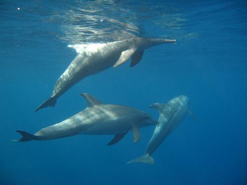 El Quseir, oct2007 Voir l'album photo de l'auteur Le mot du dictionnaire associé à cette photo ...dauphinLes mots clés du textebateau | cétacé | dauphin | globicéphale | Méditerranée | mer | odontocète | plongée | poids | profondeur | 1 |Le dauphin, cet animal mythique, fascine l'homme depuis tous temps par son intelligence, et également son comportement "ami". Il demeure l'un de nos animaux préférés, mais il n'est pas évident d'en rencontrer dans leur millieu naturel... D'où malheureusement, la création de nombreux parcs aquatiques où les spectateurs viennent les voir comme "bêtes de cirque". Néanmoins, quatre de ces odontocètes de la famille des cétacés peuvent éventuellement être rencontrés en plongée: - Le Marsouin ou Phoceana phoceana Egalement appelé cochon de mer, il est carctérisé par une tête arrondie, tronquée avec un museau court. Le ventre est clair et le dos gris foncé. Une ligne noire court de la base des nageoires jusqu'à la bouche. Il peut mesurer de 1,5 à 2 mètres et peser jusqu'à 90 kg. Cet animal farouche peut être observé par temps calme, en Méditerranée, en Bretagne, et même dans l'estuaire de la Seine. Sa longévité est de 12 à 16 ans. - Le dauphin des anciens, Delphinus Delphis La tête présente un long museau, fin et aplati, bien démarqué du melon (partie frontale renflée). Son oeuil est cerclé de noir. Son corps est long (1,8 à 2,6 mètres) et fuselé, tandis que son poids peut varer de 90 à 140 kg. L'animal peut atteindre les 45 km/h ! Le dos et les nageoires sont sombres, et le ventre et les flancs sont clairs. Il affectionne le voisinage de l'homme et joue volontier avec les étraves des bateaux. On peut en rencontrer plutôt en Méditerranée. Sa durée de vie est estimée entre 25 et 30 ans. - Le Grand Dauphin, Tursiops truncatus Il est aussi appelé Dauphin à gros nez à cause de son museau court. Le front est particulièrement bombé par un melon très marqué, et la machoire inférieure est légèrement plus longue que la supérieure. Il peut mesurer jusqu'à 4 mètres de long et peser entre 200 et 600 kg ! Sa coloration est plutôt uniforme, grise, avec une tendance plus foncée sur le dos et un ventre clair. D'une durée de vie d'environ 35 ans, c'est une des espèces les plus connues et les plus étudiées car très souvent emprisonnée dans les marinlands. - Le Dauphin Pilote, Globicephala melaena Le globicéphale, comme son nom l'indique (-céphale: tête, globi- : globuleuse), a un front très proéminent qui se raccorde directement à la bouche. La longueur du corps peut atteindre les8 mètres et son poids jusqu'à 4 tonnes! La couleur du corps est noire. Les nageoires pectorales, longues, sont fixées très près de le tête. Une de ses particularités est qu'il sonde : en effet, les globicéphales pourraient atteindre - 1000 mètres de profondeur lorsqu'ils plongent... Ne comptez donc pas en croiser en plongée...... Quelques recommandations: Si d'aventure vous croisez un dauphin, ou un autre animal sauvage, et que vous voulez profiter de cette rencontre, ne vous précipitez pas sur l'annimal, evitez les grands gestes brusques et les cris violents.... Approchez vous calmement et laissez le choix à l'animal. Evitez de toucher leur peau fragile, vous pourriez transmettre à l'animal des bactéries ou des champignons microscopiques qui pourraient parasiter l'animal. Enfin, en cas d'échouage, humectez l'animal rapidement et en permanence, et prévenez les pompiers. N'essayez pas de tirer l'animal par les appendices pour tenter de le remettre à l'eau, et pensez à dégager son évent, seul orifice respiratoire.