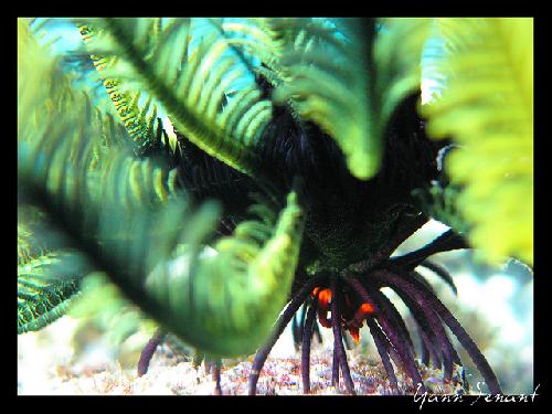 Crinoïde prise sur l'archipel de Takabonerate en Indonésie. Voir l'album photo de l'auteur Le mot du dictionnaire associé à cette photo ...échinodermeLes mots clés du texteéponge | benthique | corail | gorgone | holothurie | mer | photo | profondeur | respiration | rocher |Les échinodermes, du grec -ekhinos "épine" et -derma "derme", composent un embranchement original qui compte près de 6000 espèces marines benthiques. On les rencontre dans toutes les régions du globe et à toutes profondeurs. Le terme d'échinoderme regroupe cinq classes, très différentes d'aspects : - les astérides (étoiles de mer), - les échinides (oursins), - les ophiurides (dont les gorgonocéphales), - les crinoïdes, - et les holothuries (ou concombres de mer, photo ci-contre). Ils constituent un groupe très ancien d'animaux marins, dont les premières traces fossiles remontent à 700 millions d'années au Cambrien. Ce groupe compte entre 6000 et 7000 espèces vivantes, avec une suprématie des oursins et étoiles de mer, et le nombre d'espèces fossiles est estimé à environ 13 000. Bien que d'aspects très différents, les échinodermes possèdent un certain nombre de caractéristiques qui leur sont propres: - En effet, tous les échinodermes relèvent d'une symétrie pentaradiale (penta pour cinq), symétrie que l'on retrouve à des degrés plus ou moins marqués suivant les groupes. - De plus, une autre constante est la présence d'un système aquifère, c'est à dire (selon www.echinodermes.org) "une structure unique dans le règne animal joue un rôle à la fois dans la respiration, la locomotion et l'alimentation". [...] Il s'agit "d'un cercle ou un anneau creux d'origine coelomique connecté à des prolongements radiaires ou podia. Le liquide qu'il renferme peut être chassé dans les podia et en provoquer l'érection. Cet appareil communique avec le milieu extérieur par une plaque criblée ou madréporite." - Une autre caractéristique consiste dans la présence d'un squelette, fait de plaques calcaires ou de spicules qui peuvent dans certains groupes fusionner pour former une coque rigide. Ces plaques sont selon les espèces, soit articulées entre elles (astéries, ophiures, crinoïdes), soit soudées (oursins). Mais chez les holothuries, ces spicules sont dispersées de façon diffuse dans le corps. Mais la grande diversité des espèces d'échinodermes en fait un groupe dont les animaux sont d'aspect, de couleurs et de tailles très variés. Ce sont pour la plupart des organismes grégaires qui vivent sur des substrats divers. Ainsi, certains échinodermes occupent les rochers (ou coraux), d'autres affectionnent les fonds meubles tels que les vases ou les sables, d'autres encore préféreront les herbiers, enfin certains présentent la particularité de pouvoir s'accrocher à d'autres organismes (gorgones, éponges...). Les modes d'alimentation sont également variables selon les espèces : suspensivore, brouteur, détritivore, carnivore, nécrophage... La forme adulte est organisée autour d'une symétrie pentaradiée, mais les formes embryonnaires sont bilatérales. Cette symétrie se retrouve dans la morphologie générale mais également dans l'ensemble de l'organisation du corps, depuis le système nerveux jusqu'au squelette calcifié. Leur système vasculaire est réduit et c'est leur système aquifère qui assure quelques-unes des fonctions vitales : échanges gazeux, locomotion et nutrition. Cependant le système digestif est complet et parfaitement fonctionnel. Enfin, les échinodermes comportent une caractéristique particulièrement intéressante concernant la régénération. Ces organismes possèdent en effet la capacité de se régénérer suite à une mutilation ou à une attaque par un prédateur. L'endosquelette, les piquants, les épines, les pédicellaires et les téguments qui ont été affectés peuvent effectivement se redévelopper suite à leur destruction partielle.