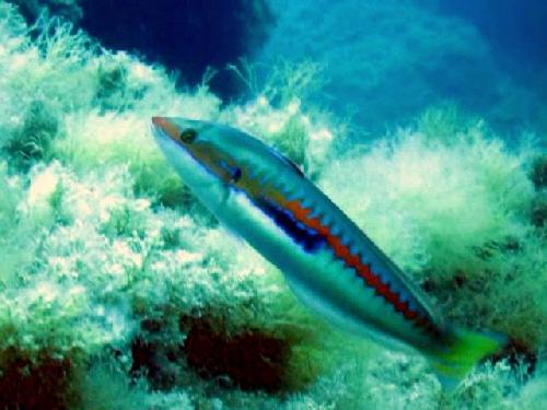 Girèle mâle ( Livrée terminale de type Méditerranée ). Taille: 20 à 25 cm. Profondeur: 1 à 60 m. Description: tâche noire bordée de rouge et de turquoise avant la nageoire dorsale. Ligne orange vif en "zigzag". Dos bleu-vert, une tache noire allongée sur le flanc. Voir l'album photo de l'auteur Le mot du dictionnaire associé à cette photo ...labridéLes mots clés du texteéchinoderme | algue | benthique | crustacé | girelle | labre | Méditerranée | mer | napoléon | photo | poisson | vieille |Les labridés (labridae) sont une grande famille de poissons comptant 500 espèces environ. Ils vivent près des côtes rocheuses, dans les herbiers (Méditerranée) ou les algues (Atlantique). Une majorité d'espèces fréquentent les mers chaudes, plusieurs espèces vivent dans les eaux tempérées et seules quelques espèces peuvent vivre dans les eaux froides. Ils ont une large distribution dans l'Océan Atlantique, l'Océan Indien et l'Océan Pacifique; plusieurs espèces vivent en Méditerranée. Ce sont des poissons qui affectionnent le milieu benthique. Les plus connus sont la vieille (Labrus bergylta), la coquette (labrus bimaculatus), le labre vert (Labrus viridis, photo ci-contre), le merle (Labrus merula) et le Rouquié (Ctenolabrus rupestris) et la Girelle (Coris julis). Bien que la famille des labridés compte de nombreuses espèces différentes, certaines caractéristiques leur sont néanmoins communes. Ce sont en effet des poissons aux comportements assez semblables mais aux caractéristiques physiques très variées. La plus part possèdent des robes aux couleurs bigarées. Les tailles sont variables : certains sont très petits (moins d'une dizaine de centimètres), alors que certains comme le Napoléon peuvent atteindre plusieurs mètres de longueur. Ils sont tous carnivores, se nourrissant de petits animaux planctoniques, parfois des petits poissons, des crustacés, des mollusques ou des échinodermes. Certaines espèces de petite taille, comme le labre nettoyeur Labroides dimidiatus, débarrassent les poissons plus grands de leurs parasites en les mangeant.