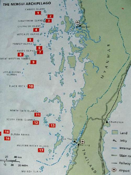 Les sites de plongée au Mergui Voir l'album photo de l'auteur Le mot du dictionnaire associé à cette photo ...MerguiLes mots clés du textealcyonaire | anémone | bateau | corail | courant | dérivante | flore | gorgone | mer | Mergui | niveau | pélagique | plongée | plongeur | poisson | récif | raie | requin | sous-marin | trésor |L'archipel des Mergui (Myeik en birman), étend son chapelet d'îles au large du littoral du Myanmar (ancienne Birmanie) en mer d'Andaman dans l'Océan Indien. Il s'étend sur 300 km le long du littoral Birman, à la frontière thaïlandaise. Ce n'est qu'en 1997, au terme de nombreuses négociations entre les autorités de Myanmar et les opérateurs de plongée, que les îles Mergui ont été ouvertes au tourisme pour la première fois depuis 50 ans. L'Archipel des Mergui n'est pas totalement inhabité: il n'est pas rare de rencontrer des pêcheurs birmans travaillant le long des voies navigables, et de plus, les Moken, peuple nomade ou "gitans de la mer", vivent sur leurs bateaux, et voyagent d'îles en îles construisant des demeures éphémères sur les rivages. Longtemps fermé aux touristes et aux étrangers, l'archipel des Mergui était et demeure difficile d'accès du fait de sa situation reculée. Aujourd'hui encore, la découverte de ce domaine encore préservé se fait exclusivement en croisière, au départ de la Thaïlande ou de la ville de Mergui sur la côte birmane. De plus l'accès en est encore contrôlé et il existe de nombreuses contraintes règlementaires qui le régissent : outre les taxes en tous genre, il est nécessaire d'avoir un permis touristique (120$ pour 5 jours), justifier d'un voyage avec tour-opérator et d'un itinéraire fixé à l'avance, à respecter scrupuleusement. Une fois passées ces exigences règlementaires, l'archipel des Mergui se révèle être un paradis vierge de civilisation où la nature intacte offre toutes ses splendeurs, autant sous-marines que terrestres. Avec des centaines d'îles inexplorées et autant de sites de plongée à découvrir... Il s'agit d'un endroit absolument unique, réputé pour sa nature originelle mais aussi pour ses concentrations de pélagiques. La plongée aux îles Mergui L'archipel des Mergui est constitué de plus de 800 îles, successions de montagnes immergées dont les sommets emergent ou affleurent sous la surface des eaux Andamanes. Territoire encore vierge, les Mergui ne se découvrent qu'en bateau. Au départ de Phuket ou de Ranong (Thaïlande) ou lors de croisières, les plongeés s'effectuent au large, sur des récifs, parois abruptes et canyons. Les plongées, dérivantes, se font dans des courants souvent forts, et la visibilité, moyenne en zone littorale, s'améliore nettement losque l'on part vers le large. L'archipel des îles Mergui commence tout juste à être exploré, et beaucoup de nouveaux sites seront sans aucun doute découverts au fur et à mesure des années. Les sites de plongée sont tellement nombreux que certains guides en essaient de nouveaux à chaque croisière. Cependant, la plongée aux Mergui ne convient pas à tous les niveaux de plongeurs (forts courants), ni malheureusement à tous les budgets. Avec des possibilités presque illimitées, la plongée aux îles Mergui se décline en centaine de sites, dont certains encore inexplorés. Les fonds sous-marins, ouverts depuis peu aux plongeurs, sont donc très préservés. La flore y est particulièrement abondante avec de très belles gorgones, de superbes alcyonaires et anémones multicolores, ainsi qu'une grande variété de coraux. Les eaux de l'archipel de Mergui recèlent de nombreux trésors. Notamment, particularité de cette région, la présence d'antennaires ou des poissons fantôme arlequin. De plus, les sites des îles Mergui sont réputés pour les pélagiques qu'on y rencontre, et plus particulièrement les grands spécimens comme les raies, les diverses espèces de requins : pointes blanches et noires ainsi que de grands requins nourrice. Si les requins à pointes argentées ou requins-marteau s'y sont malheureusement raréfiés, on y rencontre toujours des requins-baleine. Voir le thème: Quelques sites de plongée aux îles Mergui