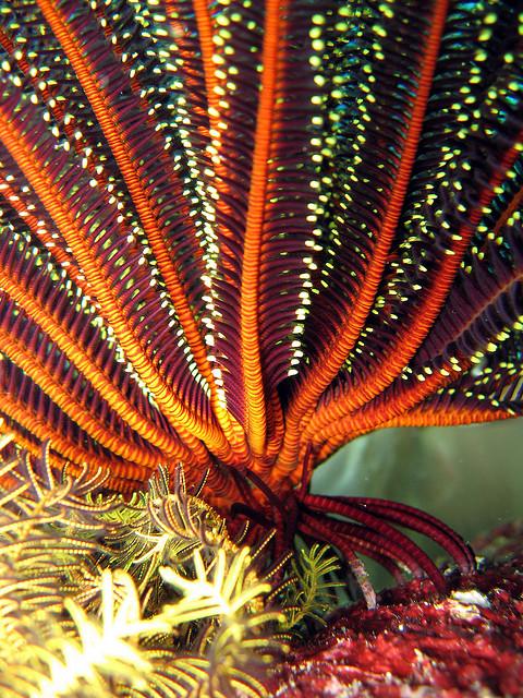 Crinoide. Sumatra. Voir l'album photo de l'auteur Le mot du dictionnaire associé à cette photo ...écosystèmeLes mots clés du textebiodiversité | faune | flore | maritime | océan | plongée | plongeur | poisson | pression | sécurité |L'écosystème est l'ensemble des organismes vivant dans un milieu : la faune, la flore et les bactéries. Les organismes qui y vivent interagissent avec le milieu pour former l'écosystème. C'est une question d'équilibre ! Il n'y a pas UN, mais DES écosystèmes marins. En effet, l'espace maritime est constitué de multiples écosystèmes aux fonctionnements variés. Les écosystèmes marins sont des milieux fragiles et soumis à des pressions croissantes. La pêche et les transports, ainsi que les principales activités dans les eaux marines et côtières, sont assortis d'autres pressions relatives au développement. Les résultats sont manifestes : les habitats marins ont été modifiés de manière spectaculaire par la surpêche, l'introduction d'espèces exotiques, des sources terrestres de pollution et les dommages physiques causés par les chalutiers, l'exploration pétrolière et gazière et l'infrastructure sous-marine, comme les câbles, les lignes de transmission électriques et les pipelines. De ce fait, les ressources des océans diminuent dangereusement. Cette baisse est particulièrement inquiétante car le poisson, source de revenus pour des millions de personnes, revêt également une importance majeure en terme de sécurité alimentaire. De plus en plus, il devient indispensable d'explorer des stratégies pour éviter la perte de biodiversité dans les écosystèmes marins et pour protéger les principaux couloirs qu'empruntent les espèces migratrices. Pour les scientifiques, un des enjeux est de mieux quantifier les effets de la pêche sur les écosystèmes. De nombreuses lacunes persistent encore dans ce domaine, car ce n'est que récemment que l'effort de recherche porte sur le fonctionnement des écosystèmes dans leur ensemble. Le plongeur ne peut rester indifférent à cette problématique, car le plaisir des yeux et la passion de la plongée sont indissociables de la préservation du milieu marin.